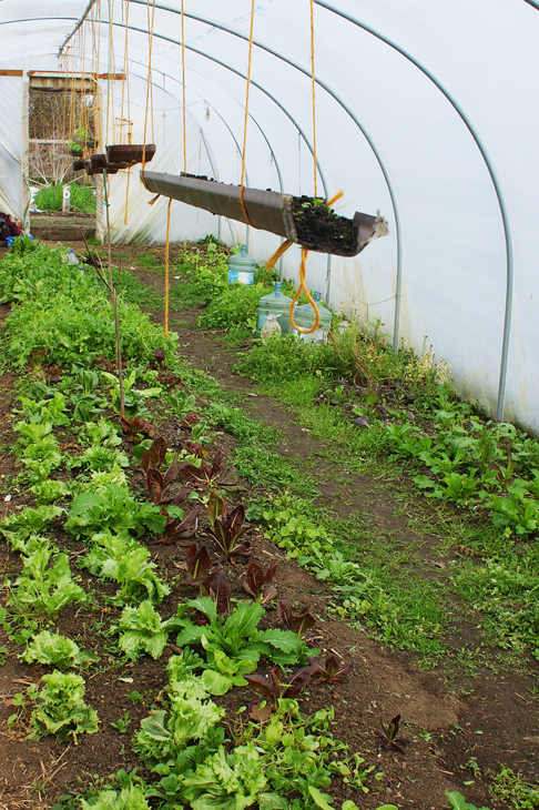 Abundant Earth is a Community Supported Agricultural Scheme in Broompark, County Durham. They supply seasonal organic vegetables through a vegetable box scheme to the local area. It is run as a workers co-operative and supported by the Soil Association. They have recently started providing eggs from their red hens. Although they do not live on site their use of land is a useful example in land-based living and in generating a sustainable income in an organic environmentally-sensitive way. They are careful to only promise to provide seasonal food and never supply produce from outside of the country (unlike some other organic vegetable box schemes). The rich variety of their produce and the beautiful layout of their gardens and polytunnels make it an inspiring place to be.