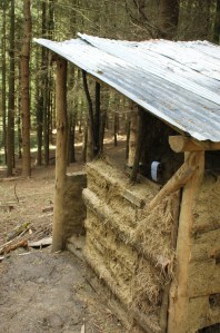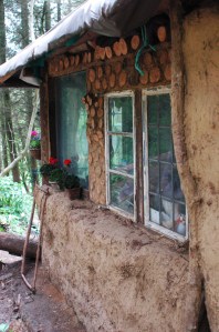 As Laughton notes “wood provides the fuel for all cooking, space and water-heating, and a wind-generator and solar panels provide enough electricity for lighting, stereos and laptop computers” (2008, p.146). That the fires had to be lit was quite noticeable considering it was May. But the houses do not have high thermal mass and do not benefit from passive solar gain (because of the trees); rather their main eco-features are that they are mostly made from natural material, onsite, built by the people living in them through a process of experimentation. This is true low-cost eco-housing using local free natural materials. Moreover they have a ready free supply of wood onsite. There also seems to be an ethos that it is important that buildings are temporary, that being low impact is also about being able to remove a house easily, and as such the houses should not be too solid, or too robust as that would belie their temporary design.