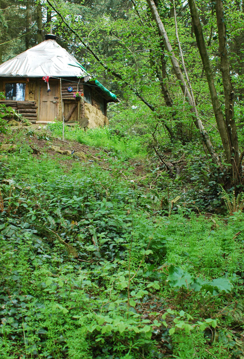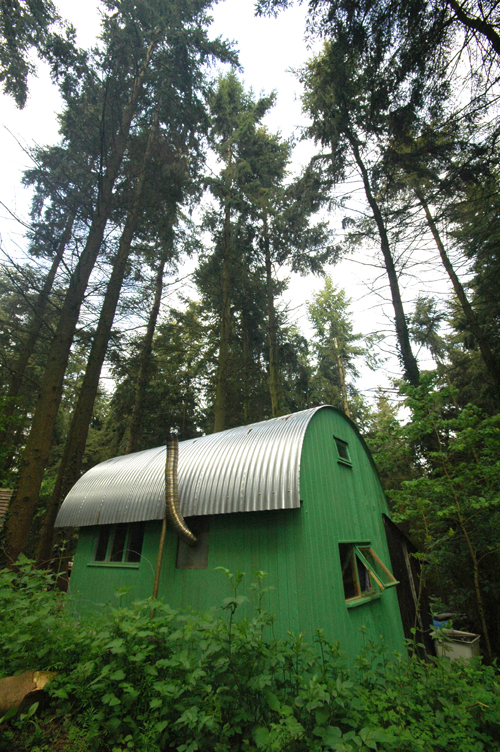 I liked a lot of the buildings on site, with each being different and each had their endearing features. I particularly enjoyed the view from the compost toilet of the woodland below with deer milling about and ignoring your presence. It probably rates as one of the best toilet locations! They also have a great bath house – an asset I have not seen in other communities I have visited. There are perhaps two particularly inspiring houses. One is by Charlotte – she built a strawbale, cordwood, cob and pallet house by herself, without any prior experience of building. Taking only 11 months to build it is a beautiful, inspiring house perched on the side of the hill. Inside it has a large living space and then two different level sleeping platforms high into the roof. Dan built a green painted house cum workshop with a curved metal roof. It sits wonderfully in the forest like a colourful bunker that looks cosy and purposeful at the same time.