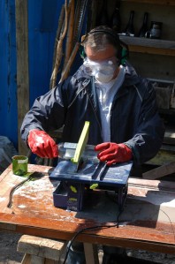 Cutting bottles and making glass bottle bricks at Brighton Earthship