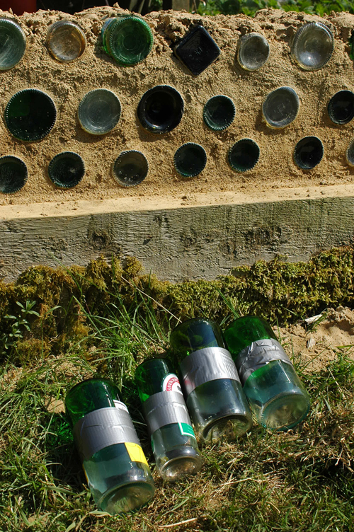 For a non-load bearing wall (i.e. a wall that does not support any significant structure and weight of your building) a wall made from recycled glass bottles adds a colourful addition. We made one using a wet tile cutter to slice the bottles. Using two similar sized bottles you tape them together using duck-tape, then using cement and sand layered them to build the wall. It should be constructed in a ‘honeycomb’ pattern to give it strength with a minimum of 1.5 inches of mortar around each glass brick. Then you use a sponge and water to wipe off any excess mortar. Using this method you can only do a few courses a day as you need to allow the mortar to dry in-between. For more information on building a glass bottle brick wall see: http://en.wikipedia.org/wiki/Bottle_wall.