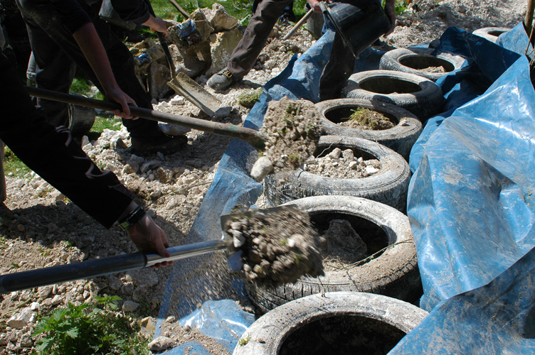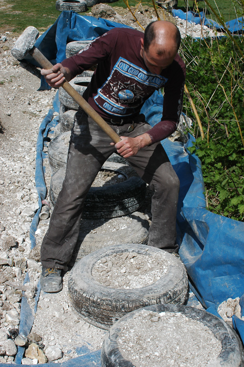 Once you have chosen a selection of same size tyres (185 depth is ideal, with over 60 tread width) you line them up and shovel in earth. Using a mallet this earth is then rammed into the tyre. This process is repeated until the tyre is completely hard and feels solid throughout. The second layer of tyres is then put in, using cardboard to line the bottom of the tyre, and setting back the tyres an inch from the bottom row (so the wall effectively leans back slightly). Once you have the size of wall you want you can finish in off with a cob in-fill and a lime render to provide a smooth finish. More information on how to build a tyre wall: http://www.sustainablebuildingresource.co.uk/wiki/index.php/New_build:earthship:_tyre_ramming.