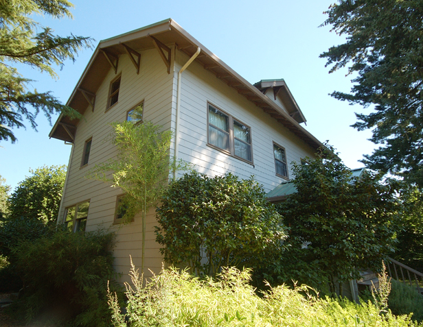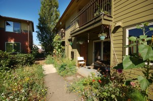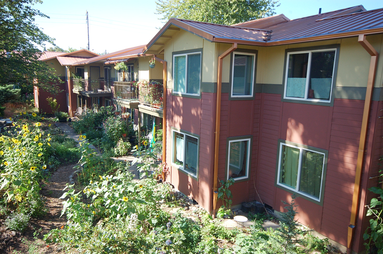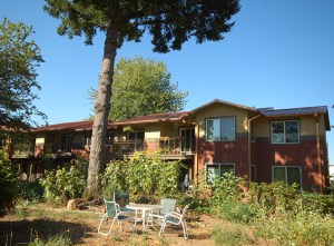 Columbia eco-village is a relatively new co-housing project in the north east of Portland. It is on the site of an old nut farm which was partly sold to developers in the 1960s who built five apartment buildings. These buildings and the remainder of the farm and farmhouse now constitute the eco-village. Using a loan the original buildings were dramatically eco-retrofitted – stripped and gutted with new roofs and ecological materials. They added many new ecological features such as rainwater harvesting off the new roofs, and added eves and gables to provide shade and have hopes and plans for more such as photovoltaic panels.
