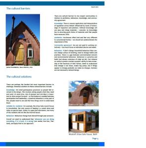 The report identifies three key types of barrier to low impact communities: political, economic and cultural, and outlines what these barriers entail and some possible solutions. It also outlines four different case studies, and some other issues which are important to consider when encouraging eco-housing. Finally, the report outlines common pitfalls and the best way to successfully build low impact communities, which I argue involves: