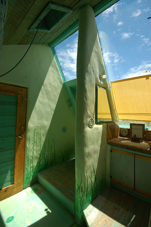 There is a great sense of freedom from knowing that a house has everything you need to survive without needing to be connected to anything else. All the systems are holistic and autonomous. Standing on the roof I am next to the water cistern which collects the rainwater, and overlooking the PV panels and solar thermal hot water heater. Moreover all resources are used as efficiently as possible, for example, rainwater is used three times – for drinking, to flush the toilet and then to water plants. Having stayed in one at the height of summer I can also confidently confirm that it works – nice and cool during the day, warm at night and not too dark inside. Such autonomy also enables the resident to more clearly understand how houses work – if you are not careful you will use up all your water – and thus, potentially, how to look after and fix it.