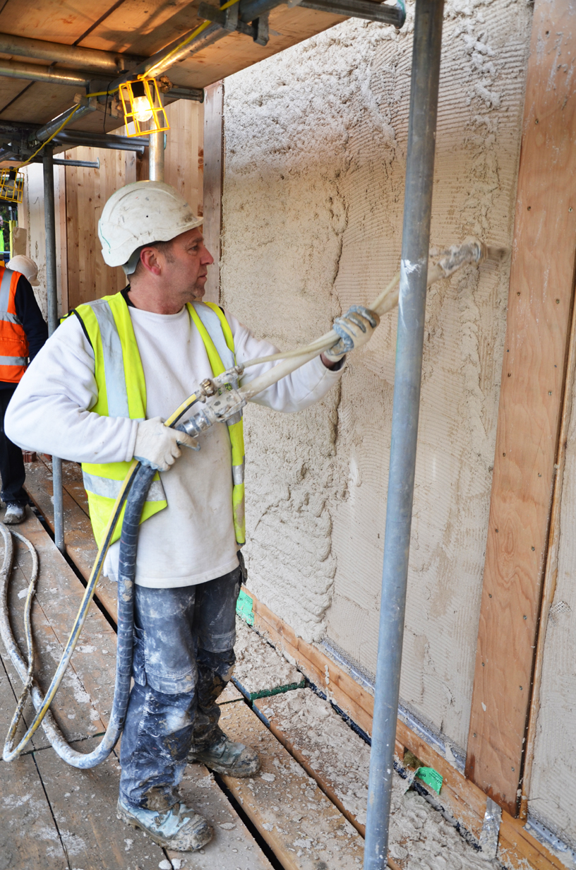 Rendering the straw bale panel walls and inside an almost completed house with floor to ceiling windows