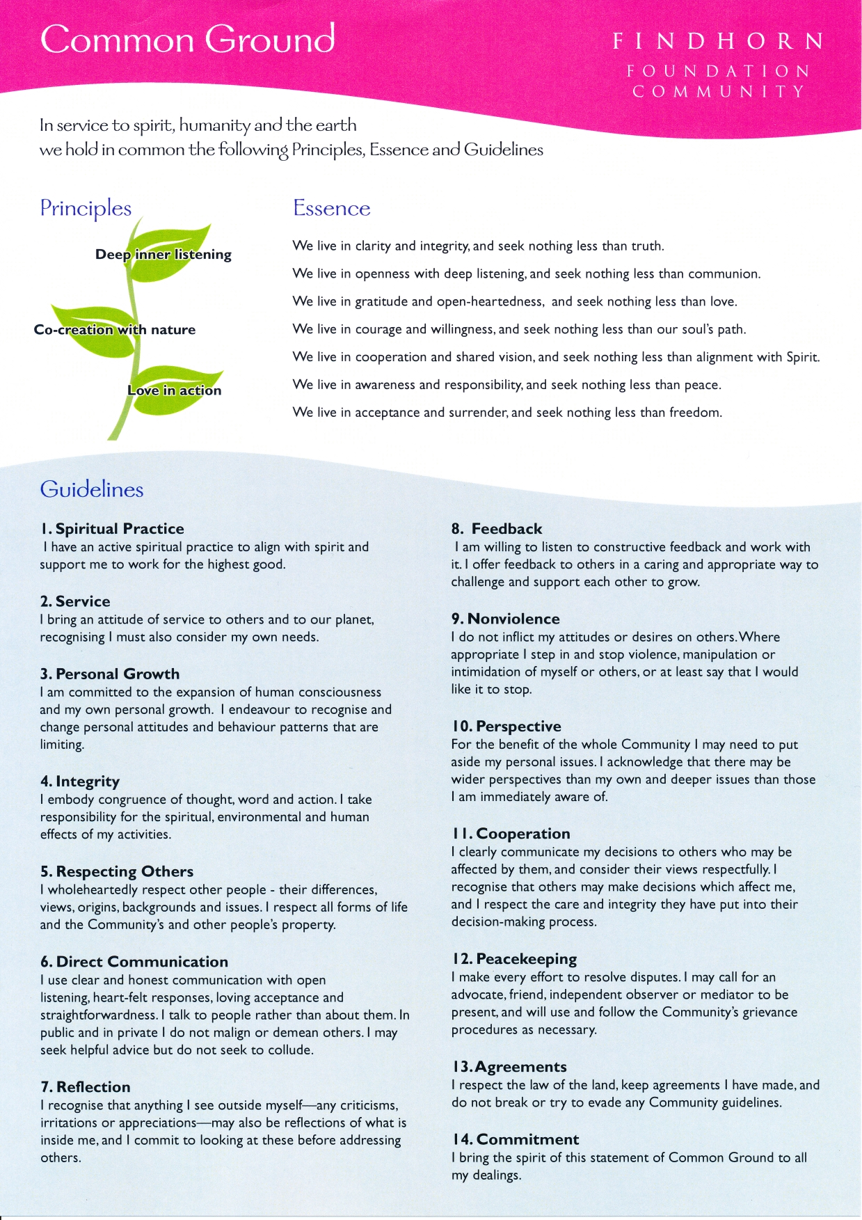 Findhorn was separated into the Findhorn Foundation (which includes the Findhorn Foundation College and New Findhorn Directions, and does the work of running the infrastructure and visitor facilities) and the broader community organisations and individuals working onsite. In the 1990’s many of the business which had been developed within Findhorn became independent (such as Findhorn Press, Trees for Life, The Phoenix shop, and The Game of Transformation), but remained physically in the eco-village. The umbrella organisation over the whole village is the New Foundation Association (NFA), formed in 1999. In seeking to outline what communality there is across these potentially disparate groups a statement of Common Ground which outlines 14 guidelines for the Findhorn Foundation Community was developed.