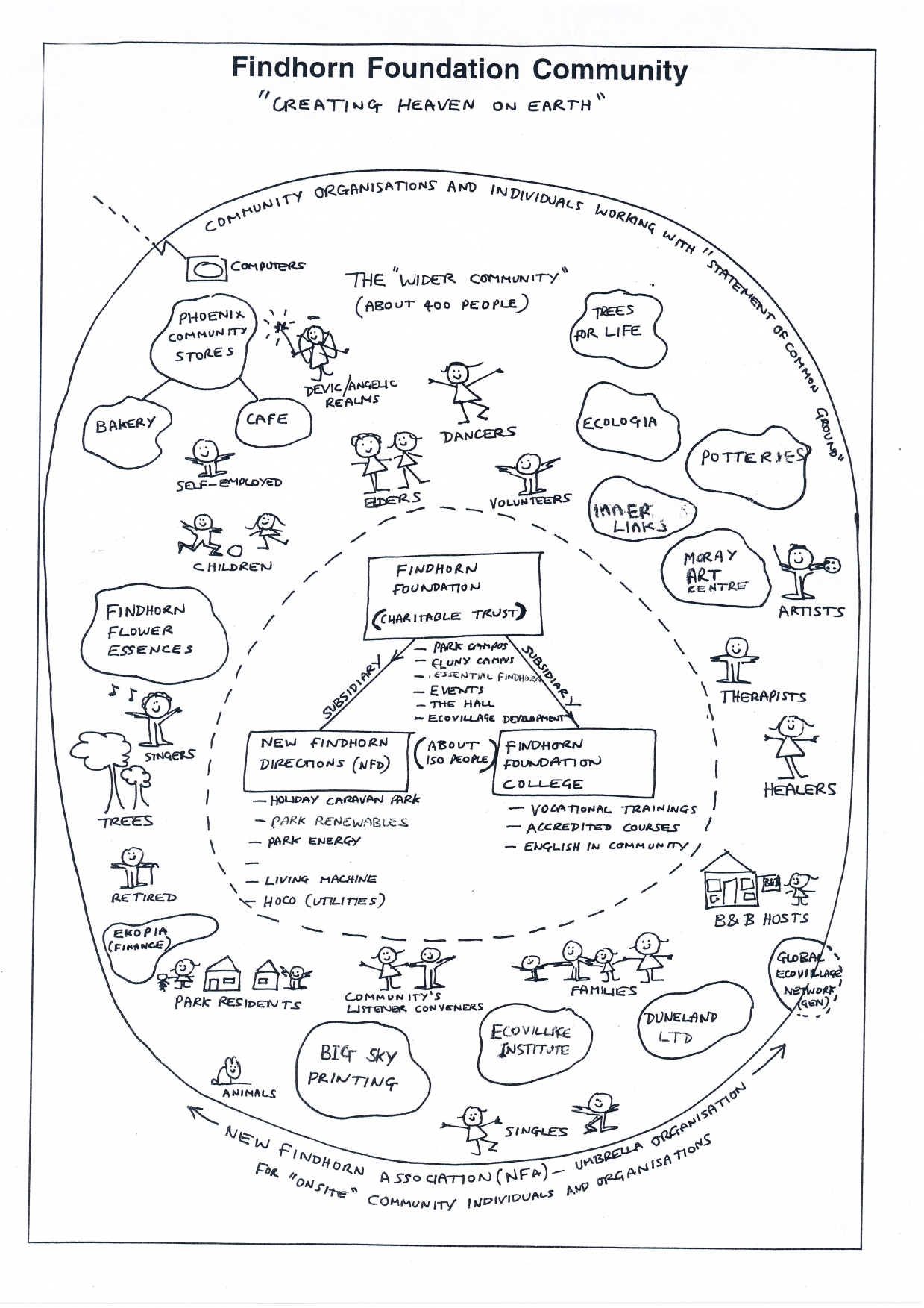 Given Findhorn’s haphazard growth and development it is not surprising that it has had to develop (and then re-develop) its governance structures as the community grew and needs changed. In the 1990’s there was significant change, triggered in part by its continued growth, but also financial difficulties.
