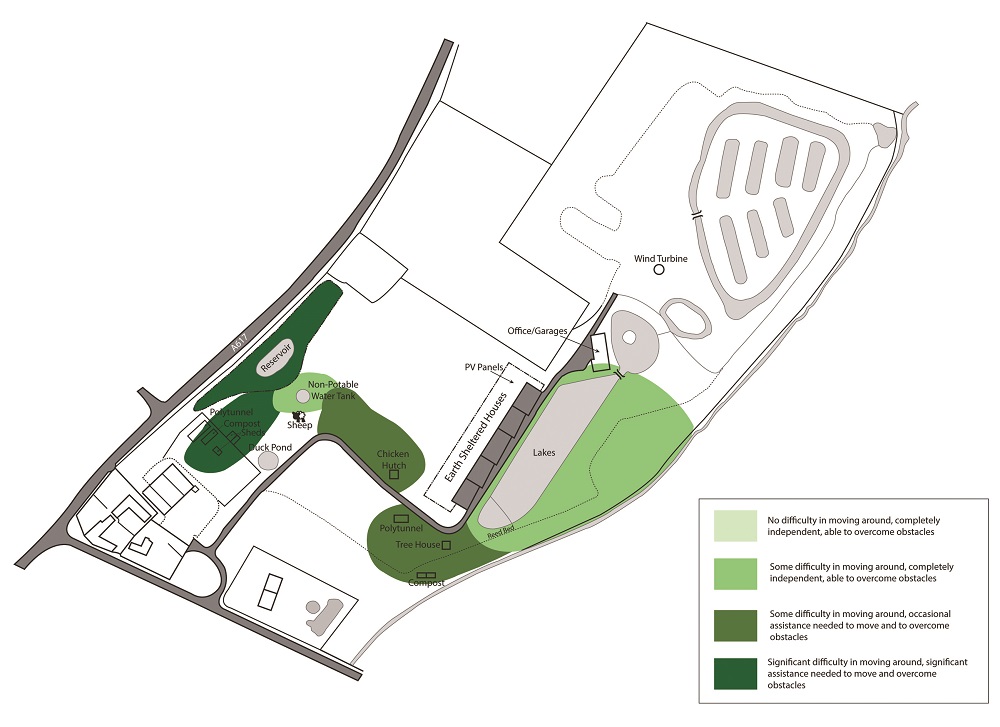 As these maps show, the speed and the range of movement in terms of the extent of how much help I need to get around Hockerton decline as I moved further away from the houses and into the broader community. Another interesting aspect to note is that as distance from the houses increase, the various areas of the community at Hockerton are used for increasingly ‘ablest’ activities which are suited to able-bodied people, from rearing sheep, to growing vegetables, to coppicing. Although it may theoretically be feasible for a mobility-impaired person to reach the outer areas of the site, the challenging nature of the community environment may pose difficulties in returning to the homes easily due to fatigue. This raises significant questions over the participation of disabled people in activities around the community environment, and the extent of independence they may have in living in a sustainable community. By re-developing the concept of ‘disability’ to include mobility, we can understand that sustainable communities at present compromise the inclusion of disabled people.